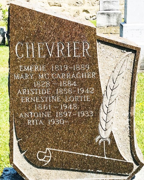 There were so many Chevriers in the cemetery it seemed impossible that one would find Emerie! Every second or third headstone was a Chevrier. It became apparent that more specific information would be required to find the father of my great-grandmother, Marie Philomene Adele Chevrier, one of Emerie’s twenty-one children.