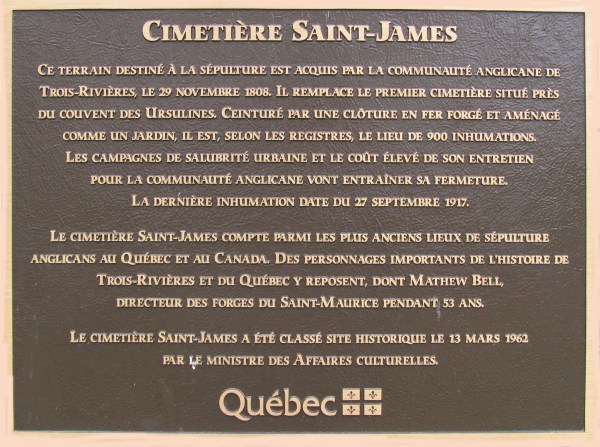 Located at the corner of Saint Francois Xavier and de Tonnancour Streets in the old part of Trois Rivieres. It was classified as a Quebec Historic Site in 1962 and is one of the oldest Anglican cemeteries in Canada. The land was acquired by the Three Rivers Anglican Community in 1808 and the cemetery was used until 1917. (It is also known as Cimetiere Saint-James) https://www.findagrave.com/cemetery/2517306/saint-james-cemetery