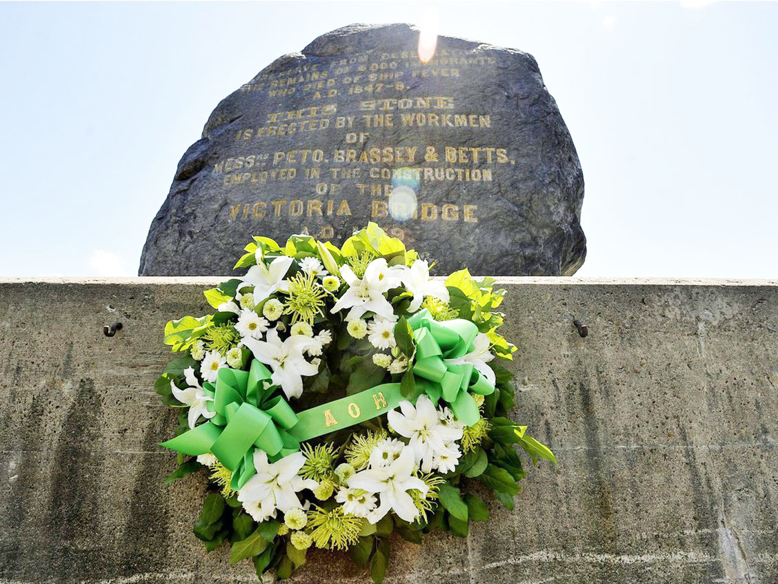 A wreath sits at the base of the black rock in Point Saint Charles, Montreal, Sunday, May 31, 2009, after a ceremony to commemorate the Irish immigrants who died of typhus in Montreal after fleeing the potato famine in 1847. photo THE GAZETTE/Graham Hughes. PHOTO BY GRAHAM HUGHES /Montreal Gazette