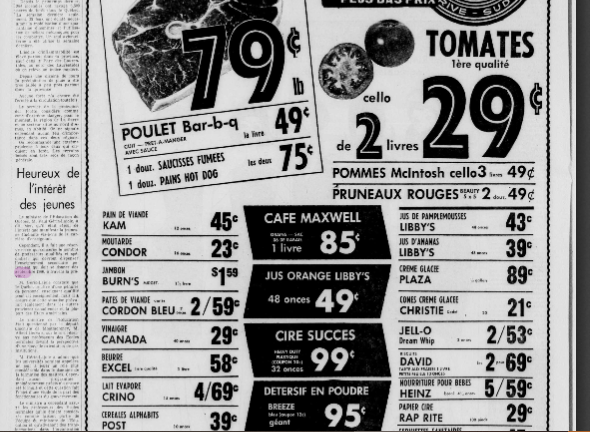 Prices in 1962 in Quebec City from Le Soleil newspaper BANQ. My mother’s coffee was instant Maxwell House with Carnation Milk. I made a bazillion cups for her.