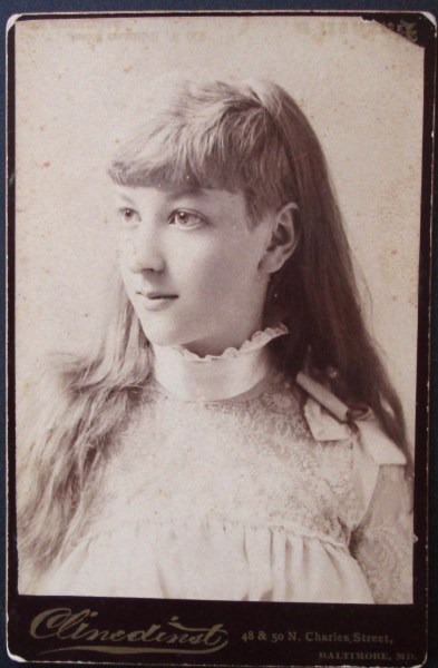 The first clue was the photographer’s name and address. Barnett M. Clinedinst Sr and Jr had a studio in Baltimore from 1880 to at least 1891. Clinedinst Sr. began as an artist and turned to photography after the Civil War. He built up a prosperous business in Staunton, Virginia and later settled with his wife Caroline McFee and children in Baltimore. His son followed him into the business and they opened a studio in Washington DC where they photographed Presidents, military men and societie’s elite. Barnett Jr became the official White House photographer for three administrations. They were also innovators and were some of the first to use flash lighting.