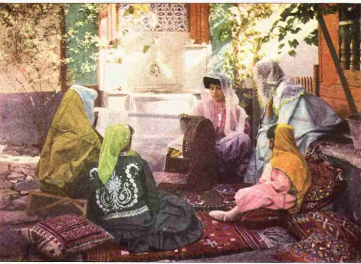 Syrian girl with her wares. (National Geographic, November, 1925. Article cited below. This magazine is in the public domain according to Library of Congress. Gervaise Courtellemont. Lumiere company.
