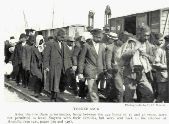 “Refugees from anywhere within 150 miles inland herded seaward into Smyrna. At first they came in orderly trainloads or in carts, with rug-wrapped bedding, some little household equipment, and perhaps even a few animals, But as the distant military momentum speeded up, the influx became a wild rabble of ten, then twenty, then thirty thousand a day. Their increasingly scanty possessions betokened a mad and yet madder stampede from the scene of sword and fire, until September 7 saw utterly destitute multitudes staggering in, the women wailing over the first blows of family tragedy, whereby mothers with no food for their babies had been forced to abandon their older children in wayside villages….