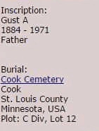 Gust Atiel Gustafson born in 1884 lived another 4 years after Ida’s passing. He died at the age of 86 in the spring of 1971 and is buried in Cook, Minnesota beside his first wife, Josefina