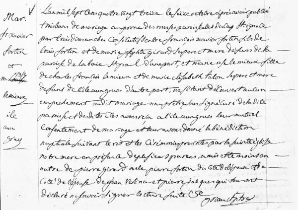 My third great-grandfather Francois Xavier Fortin (1755-1853) was born and baptized in Saint Pierre and Saint Paul church in Baie St. Paul and married Marie Rose Lemieux (1773-1853) at Saint Ignatius of Loyola Church in Cap St Ignace in 1793.
