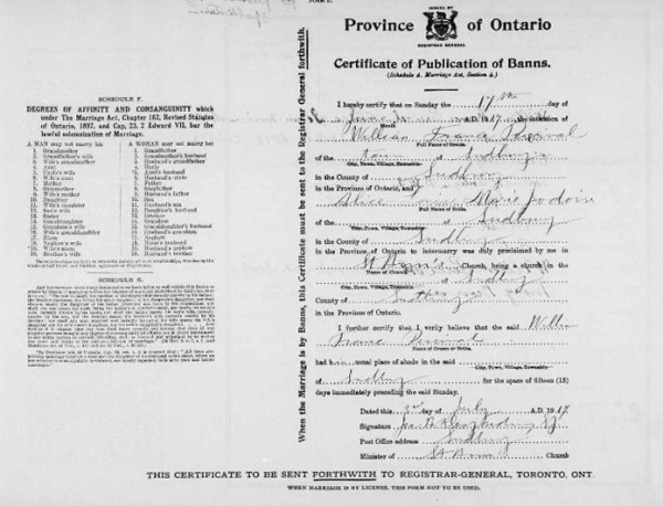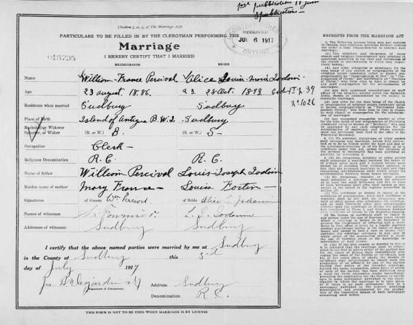 Bill began courting Alice Jodouin, the daughter of Louis and Louisa Jodouin. Before long the customary banns announcing the upcoming marriage of the young couple were published. Banns are a notice read out on three successive Sundays in a parish church, announcing an intended marriage and giving the opportunity for objections.