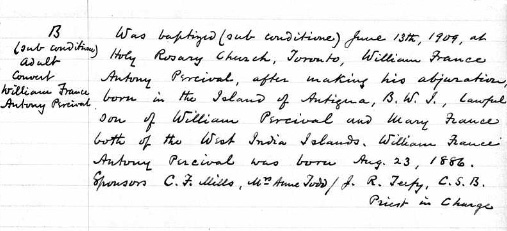 Little is known about his early years in Antigua. At the age of eighteen in 1904 he immigrated to Canada. Records indicate that on the 13th of June 1909 at the age of 23 he converted to Catholicism and was baptised at the Holy Rosary Parish in Toronto.