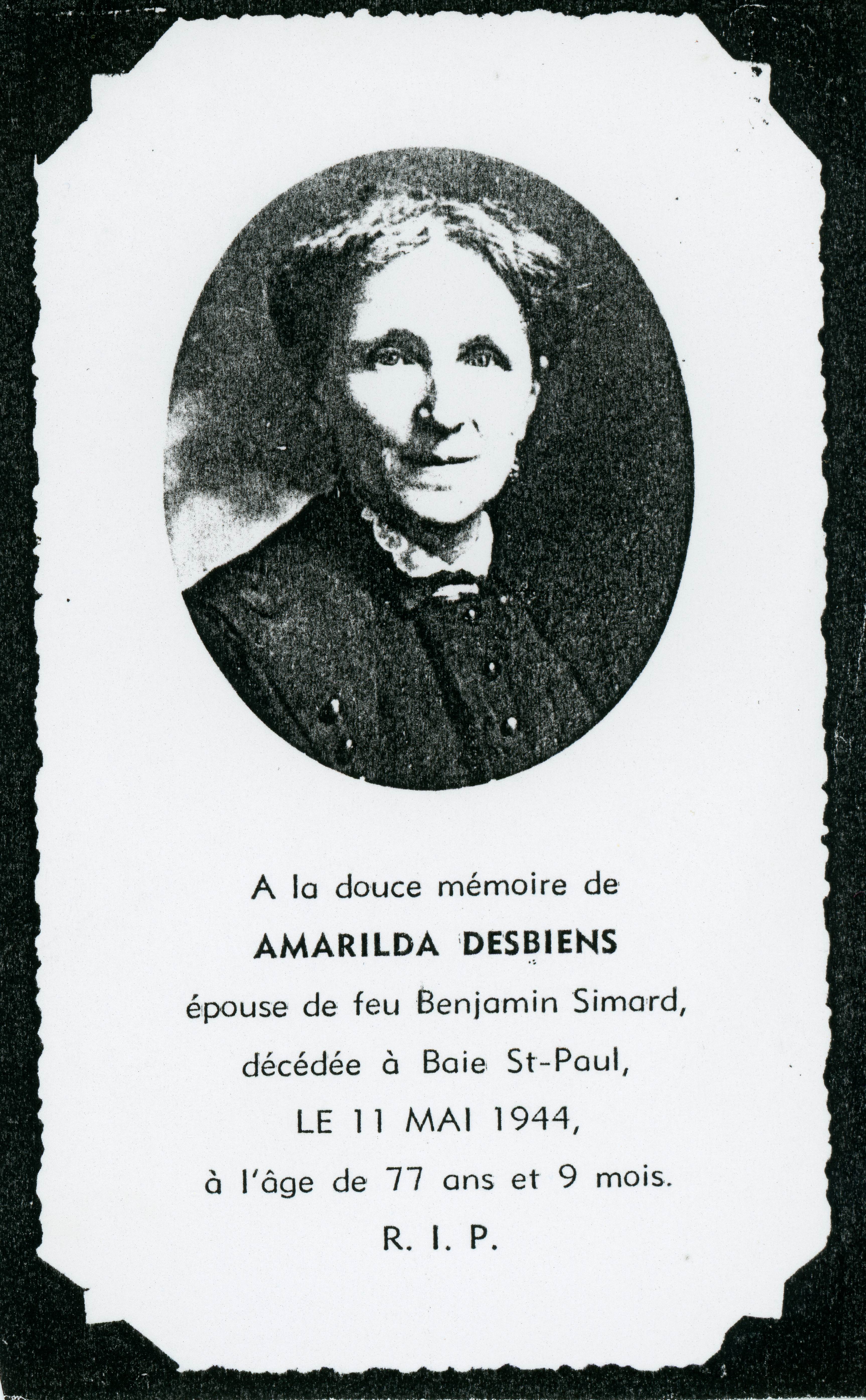 At the Société d’histoire de Charlevoix, her card was in a collection of funeral cards. I got an approximate date of birth of 1866 from the information: died May 11th 1944, at 77 years and 9 months.