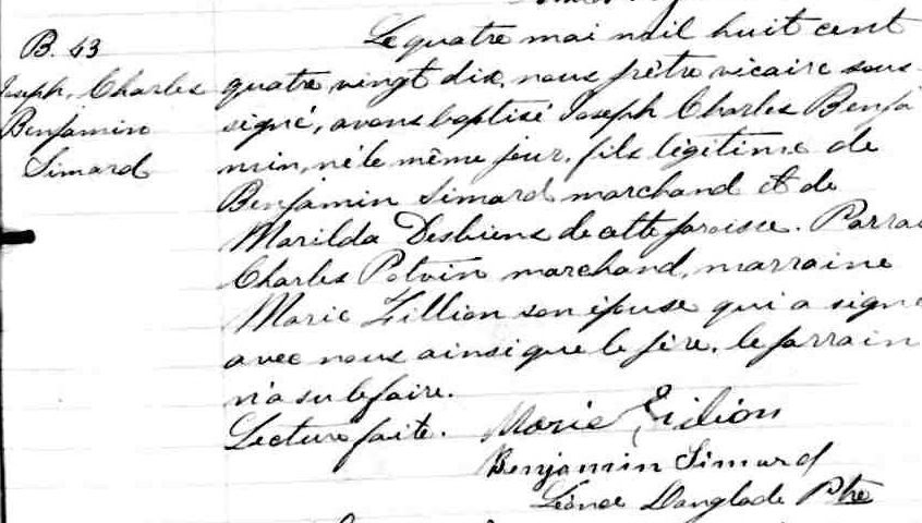 4. Charles Potvin and Marie Filion are godfather and godmother of Charles Simard, first surviving son of Amarilda and Benjamin.