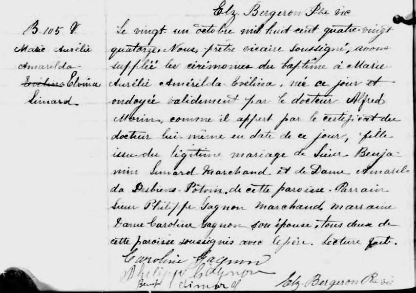 2. On the baptism certificate of Marie Aurélie Amarilda AKA Florence, Amarilda Desbiens Potvin is the mother