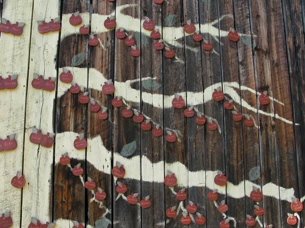 Un arbre généalogique pleine grandeur! C’est celui des Bergeron qu’on retrouve sur la grange d’un cousin. Les grand-parents se sont installés au Témiscamingue au début du 20e siècle. Leurs noms sont à la base du tronc. A chaque embranchement, deux pomme pour un de leurs enfants avec son conjoint. La branche qui y pousse, contient les pommes des enfants de ceux-ci, et les petites branches, de leurs petits enfants. Et toute cette famille se réuni chez ce cousin, quelques jours, chaque année, parce que la famille, ça se cultive!