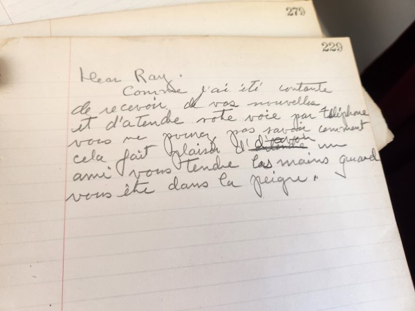 Dear Ray. How happy I was to receive your news and to hear your voice by telephone. .you can’t imagine how nice it is when a friend extends his hands when you are ‘dans la peigre.” Does she mean piege as in trap.Pegre as in underworld. If she meant Pegre, is she using a metaphor for ‘being grounded’ or does she truly mean ‘in the underworld?