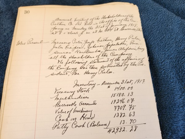 I noticed that the dilapidated black volume had originally been a minute book for The Crethan Company, a confectionery/food distribution company run out of Clarke Street by a handful of Greek men as well as my grandfather.