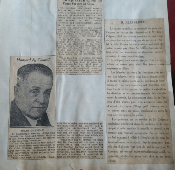 A few years after my mom died in 2009, I took a closer look at a disintegrating family scrapbook my Aunt Flo had kept. It contained yellowed news clippings from 1928 and 1930. In 1928, my father was being applauded for his 40 years of stellar service at City Hall. In 1930, he was being forced out by new Mayor Camillien Houde.
