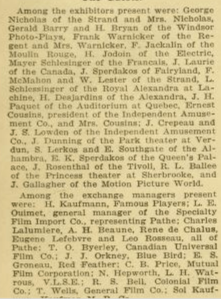 A strange bit from a May 20,, 1916 Motion Picture World with the guestlist for a bash in honor of a Pathe movie star in town written by a Gazette reporter. Seems to show my Grandfather J. Crepeau with Ernest Cousins of “Independent Amusement”. Is this a typo, supposed to be I for Isadore? Either way a mystery. Did my grandfather dip his toe into the movie business as well as the food business in 1916? Or did Isadore have the movie gig as early as 1916? George Nicholas at top is likely George Ganetakos. (I have to delve deeper. I believe Indepent Amusement became United Amusements.) And is the T Wells my husband’s grandfather? See all the Greek names? Sperdakos, Lerakos etc. and M. Ouimet of the legendary Ouimetoscope.