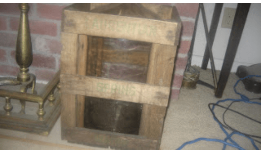 Family heirloom: A Laurentian Crate in our living room. Glass bottle of course.