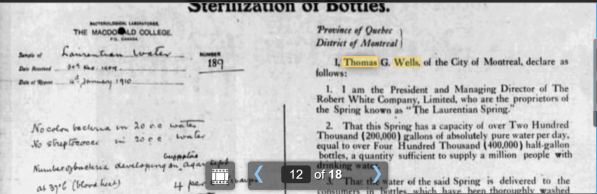 The company’s advertising, especially during the typhoid epidemics, was quite savvy, even experimental for the time. Here during 1911 in the Montreal Star, my husband’s grandfather pledges that their water is pure, showing a document from Macdonald College.