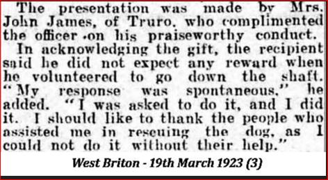 Mr Curnow was aghast……..this was a disused narrow, crooked vertical shaft and who knew how far down the dog was. But the PC insisted and Mr Curnow ran off. The PC took off his jacket and rolled up his sleeves. he knelt on the grass and peered down. This shaft was a twisted one, but he could hear the frantic yelps and barking of the beagle.