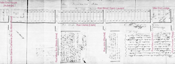 Clark (1767-1827), an English-born butcher, acquired the land he would call Mile End Farm in several transactions, including purchase agreements and leases, between 1804 and 1810.2 Like most farms in Quebec, it was long and narrow. At its greatest extent in 1810, it measured 2.5 kilometers from south to north, and between 400 and 550 meters wide. Clark was almost certainly the one who chose the name Mile End. The centre of his property was about a mile north of the small city of Montreal, and the area might have reminded him of another Mile End, a mile east of London, England. The name caught on and has been in use ever since.