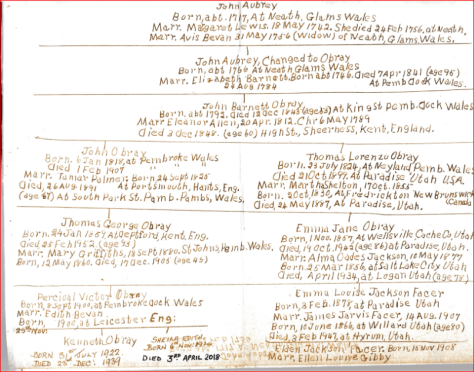 My Grandfather was born in Pembroke Dock, Wales and his Great-Grandfather had, as was usual, a large family. Two of those sons, my Grandfathers’ Uncles, Thomas and Samuel OBray became Mormons and left Wales for ‘Zion’ Salt Lake City in 1854.