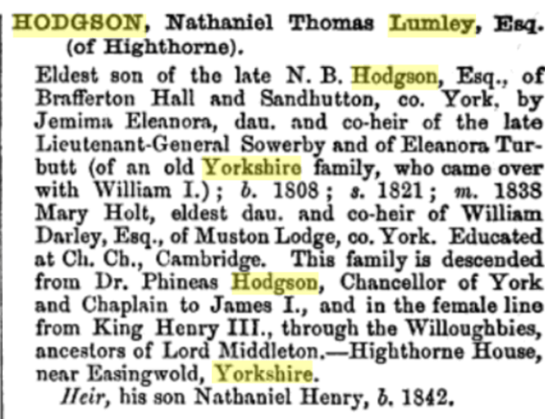 Almost all of the entries for the Lumley-Hodgson’s in the press, mostly Yorkshire press, were related to Mr. L. H.’s businesses, horse and cattle breeding. By the 1870’s he was considered an expert ‘from the old school’ so his curmudgeonly opinions on the ‘horse question’ were much in demand and have left a long paper trail.