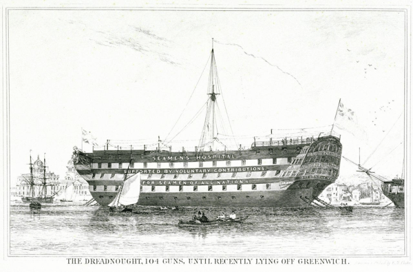 The Dreadnought Seamen’s Hospital provided seafarers with hospital care for 150 years. It started in 1821 as a wooden warship moored in the River Thames at Greenwich, England. After 1870, the hospital transferred to dry land at the former Greenwich Hospital Infirmary, and the hospital continued to treat sailors in Greenwich until its closure in 1986.11 In 1987, a Dreadnought Unit opened at St. Thomas Hospital in London.12