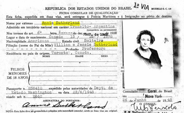 I thought I would try again to find Annie after researching her brother William. Annie is not a unique name so I didn’t have many expectations when I entered her name, birth year, and parent’s names in Ancestry. Up popped her visa for entry into Brazil in 1948! This document had her date of birth, her nationality, her parent’s names, her occupation and her picture! There she was for all to see at 69 years of age.