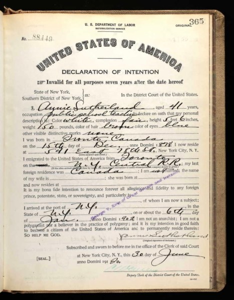 She, like her brother, decided to become an American citizen. She filed her declaration of intention in 1920, which included her renouncing her allegiance to George the V, King of Great Britain and Ireland. She received her naturalizing certificate five years later.