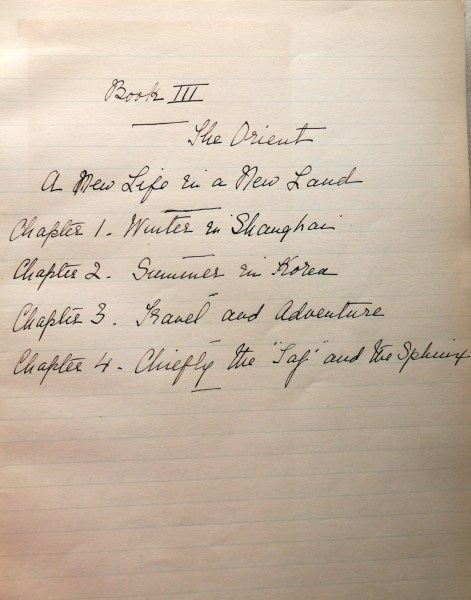 Note: This account is part of a series of journals Helen wrote later in life, handwritten in black ink in a lined, leather-bound book. These excerpts are from Book III, The Orient: A New Life in a New Land. She did not complete this volume and I do not know whether the others have survived. This one now belongs to a descendant of Helen’s niece, Ada Lindsay.