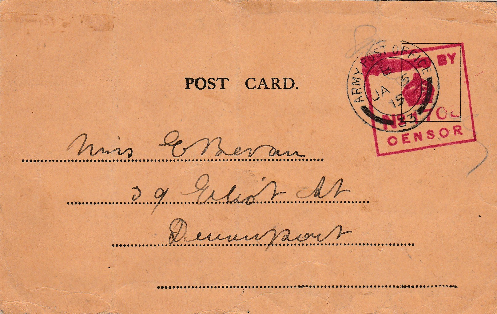 No County or Country was added but the county was Devon, in England and on the front of the Post Card, is the Censor’s stamp. The first word is blurred, but I assume it reads ‘READ by the censor. There is no stamp, but it is francked [1]  ‘Army Post Office 33’ and the date is 5th Jan 1915.