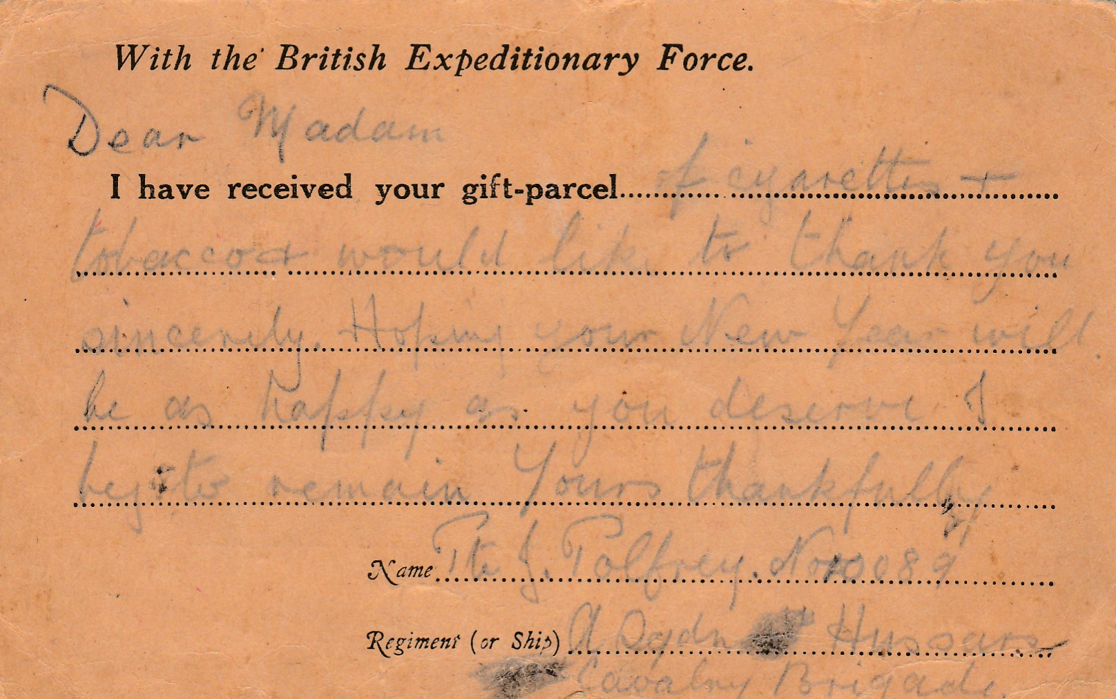 The message reads:  ‘Dear Madam, I have received your gift parcel of cigarettes and tobacco and would like to thank you sincerely. Hoping your New Year will be as happy as you deserve, I beg to remain yours thankfully