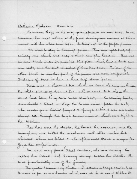 One of his pages about his grandmother, Catherine Mitcheson Bagg, recalled a visit to her home as a boy: