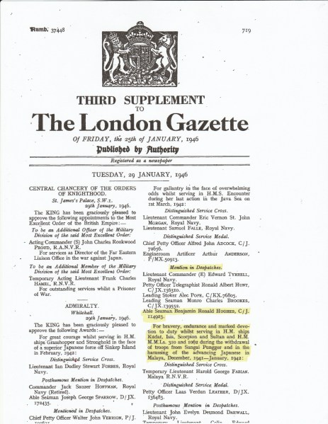 He was granted a war gratuity and a medal. Later, on the 25th of January 1946. Benjamin Ronald Hughes is ‘Mentioned in Dispatches in the London Gazette. It reads as follows.