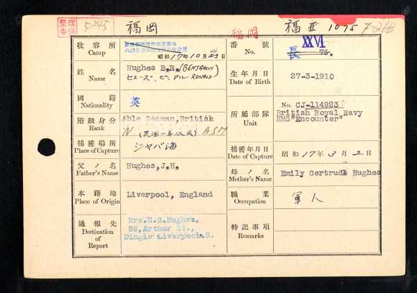 During his service, Uncle Ben served on 15 various Royal Navy ships. War was declared on the 1st of September 1939. On the 1st of March 1942, after three years of fighting, Uncle Ben was reported missing to his family. He was listed as a prisoner of war, by the Japanese. When captured and according to his Japanese POW file below, he was on HMS Encounter which had picked up allies from Malaysia and was scuttled (sunk) by her own crew, after being damaged by gunfire from heavy Japanese heavy cruisers in the Java Sea. (1)
