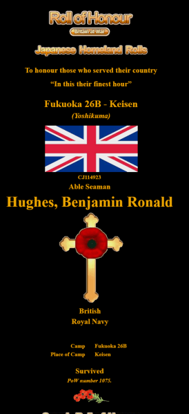 It was all second-hand because Benjamin Ronald Hughes died the year my husband was born, in 1948. However, John did have stories from his Mum, about her brother. According to her Uncle Ben suffered terribly during his 3 years as a prisoner.